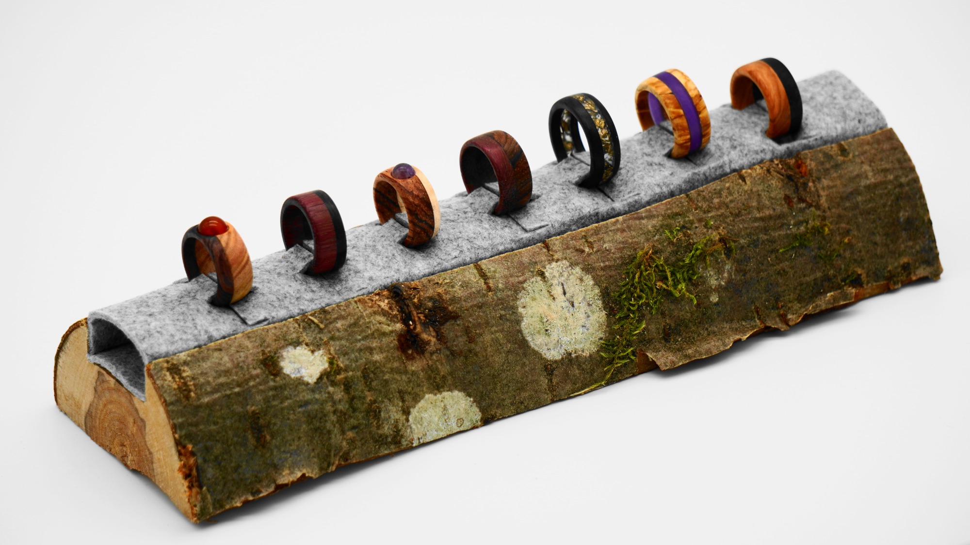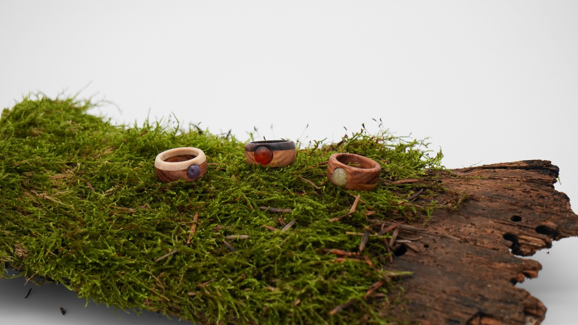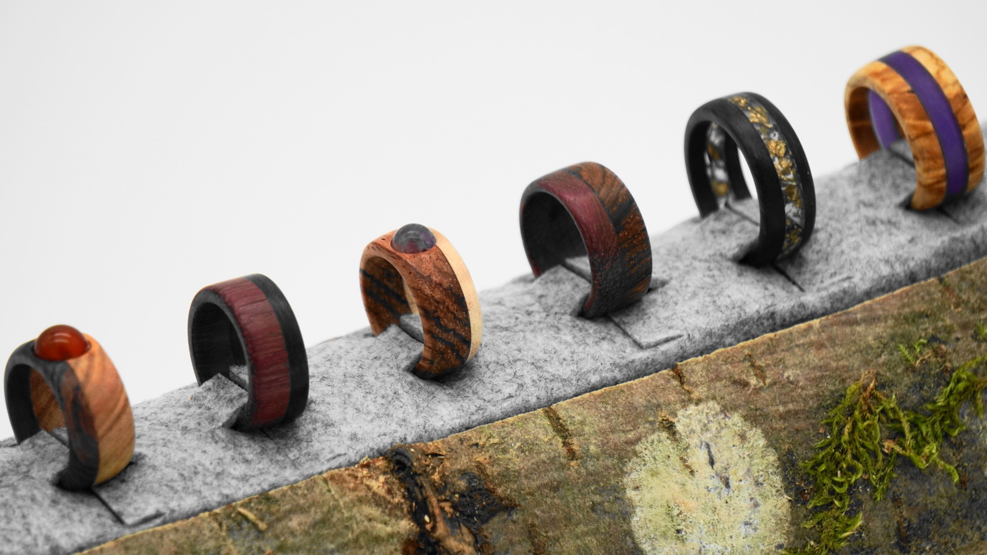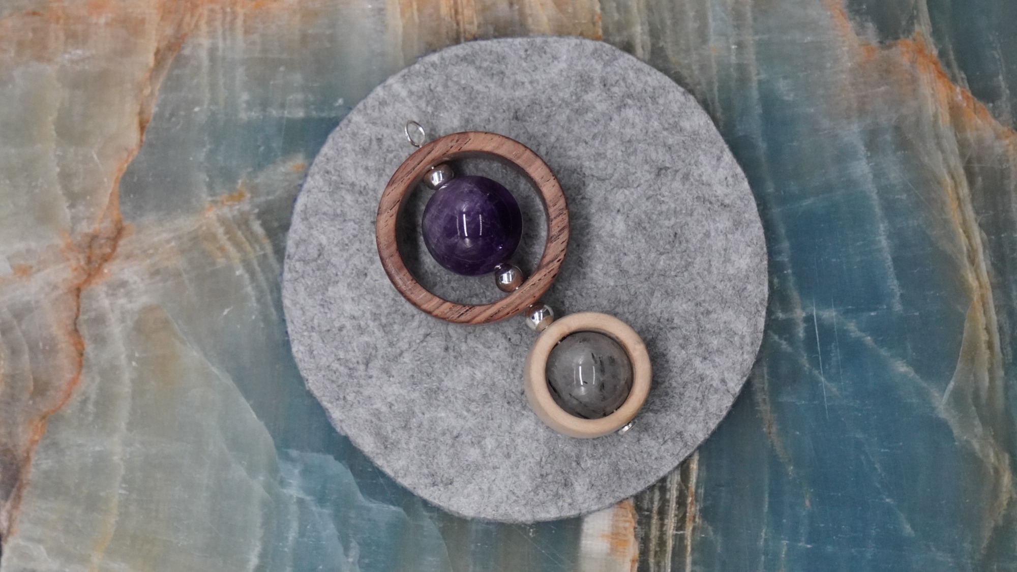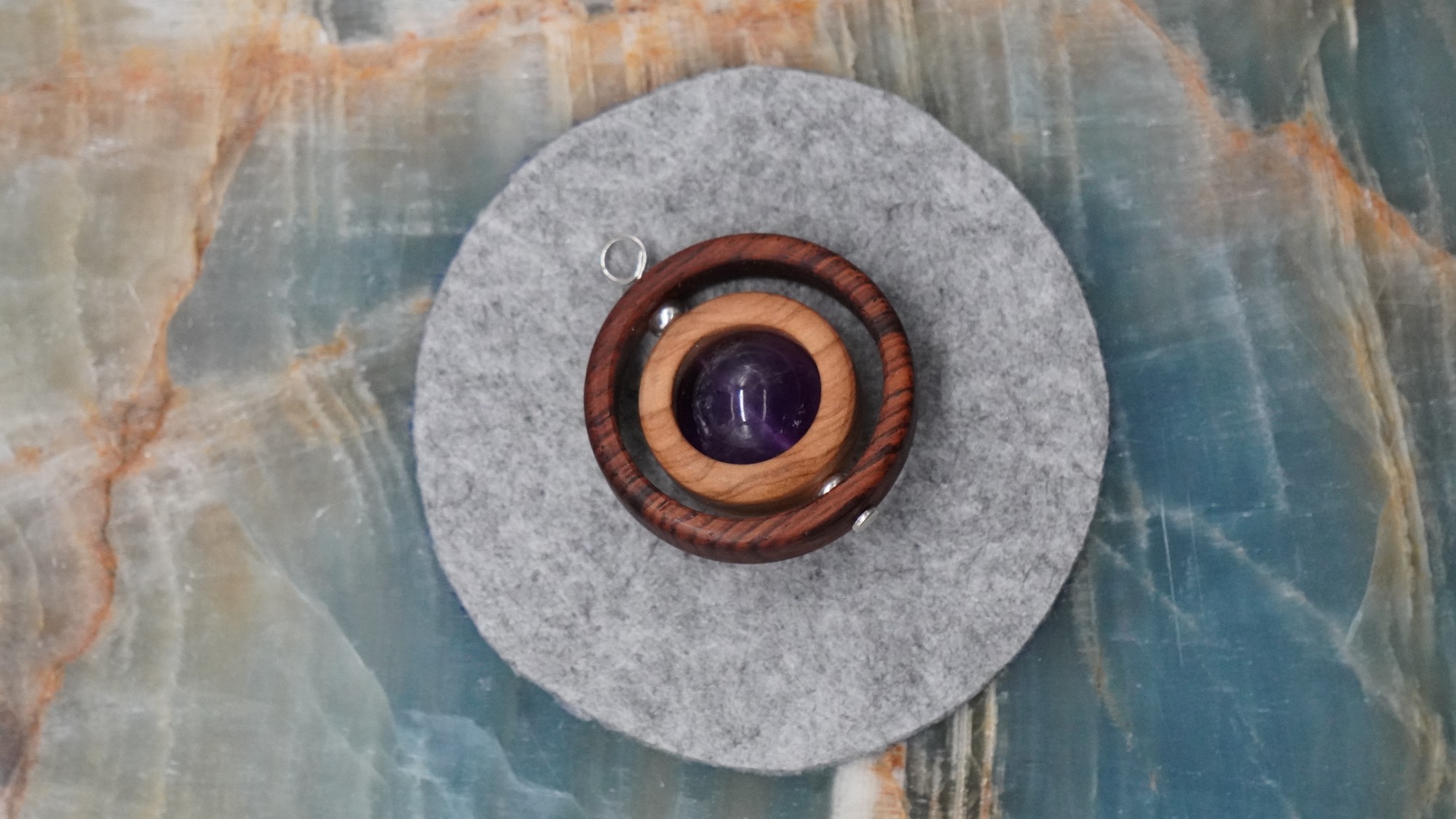 Zusammengestellt werden diese Werke aus natürlichen Materialien wie edlem Holz, (Halb)Edel-Steinen und Silber 925.