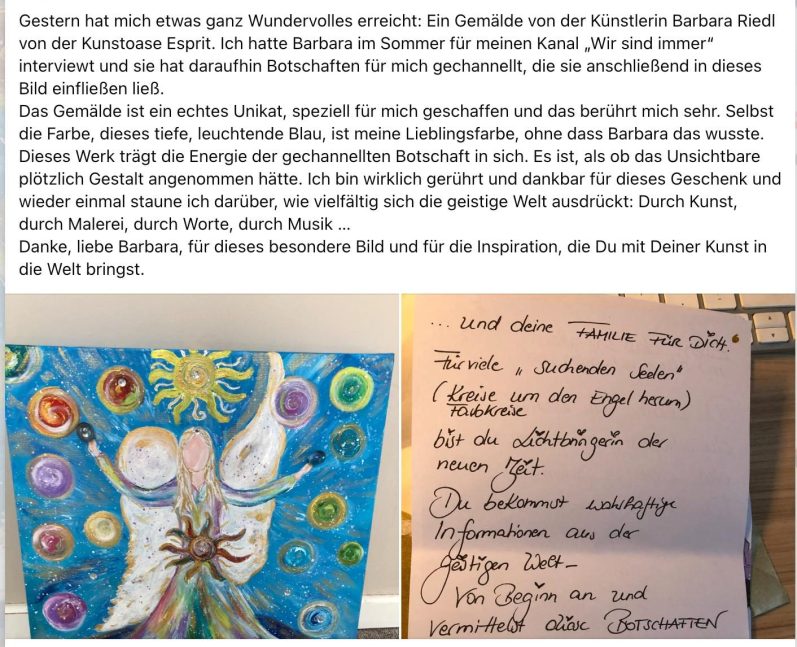 Ich habe von der Kunstoase ein wunderschönes individuelles gechanneltes großes Engelbild bekommen, was seitdem einen Ehrenplatz bei mir hat. Es ist mir so viel Liebe und Hingabe entstanden und sagt so viel aus! Danke an Barbara und ihren Mann für diesen wundervollen Raum, den ihr gestaltet! Und freu mich jetzt schon auf das nächste Bild! Julia